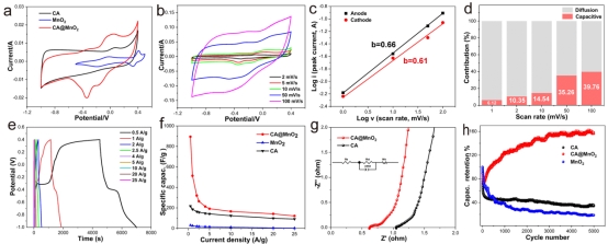 基于此,best365足球官网崔升教授团队联合齐鲁工业大学(山东省科公司)伊希斌研究员展开合作研究,制备了具有具有氧化锰均匀包覆层的CA核壳异质结构(CA@MnO2)。在弱碱性条件下,Mn2+离子经历氧化还原反应,可控地在碳气凝胶骨架表面生长,形成均匀的二氧化锰壳层。CA@MnO2不仅具有三维多孔结构,而且具有丰富的孔径范围和高比表面积。同时,MnO2包覆层的存在可以增强CA在电化学循环过程中的结构稳定性。CA@MnO2气凝胶应用于超级电容器,表现出高比电容(895.0 F/g)和优异的循环性能。当用于对称双电极超级电容器时,它具有宽的工作电压范围(2.6 V),在功率密度为250.0 W/kg时,具有高的能量密度为144.2 Wh/kg,展现出卓越的电性能。计算结果表明,MnO2壳层和CA核之间存在明显的异质界面和强烈的相互作用,有效的提高了电极材料的导电性并增加其对OH的吸附能力。该研究揭示了核壳异质结构对碳气凝胶材料电化学性能的协同增强机制,为开发低成本、高效、稳定的超级电容器电极材料提供了新的思路。