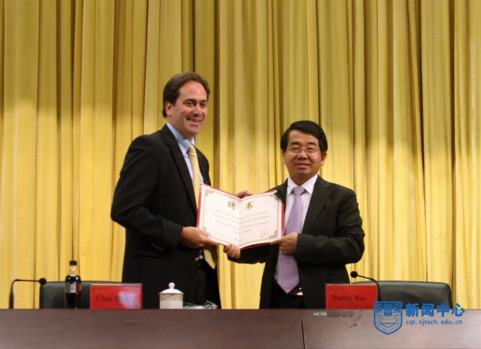 董事长黄维院士为查德•米尔金教授颁发名誉教授聘书。