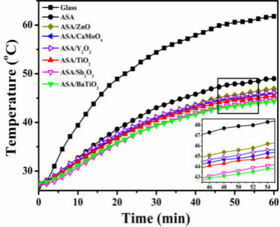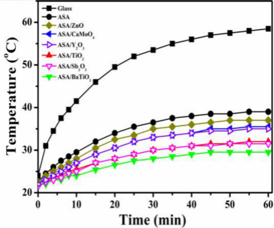 近期,协同创新中心先进高分子膜材料团队张军老师课题组博士生相波等人报道了一类新型ASA基太阳能反射降温复合材料,它是由ASA聚合物与具有高太阳光反射率的无机粒子复合制备而成,特定结构无机粒子的引入可有效地提高ASA聚合物的太阳光反射率。其中,钛酸钡(BaTiO3)无机粒子的效果最佳,可以将ASA的太阳光反射率从初始的38.90%提升至67.66%,该提升效果已经超过了降温材料领域常用的二氧化钛(TiO2)无机粒子,并且在实际降温测试中,ASA/BaTiO3降温复合材料也表现出了最佳的降温效果。迄今为止,BaTiO3无机粒子多用于电子材料领域,而关于其在太阳能反射降温复合材料领域的应用却鲜有报道,张军老师课题组率先将BaTiO3应用于该领域,为太阳能反射降温复合材料的发展开辟了一条新的道路。该工作目前已经发表在Compos. Sci. Technol.,2017,145,149-156。