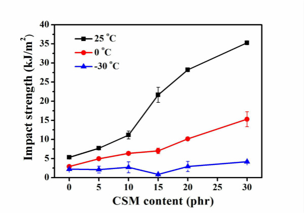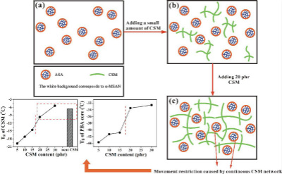 近期,协同创新中心先进高分子膜材料团队张军老师课题组研究生赵鹏飞等人报道了在ASA/α-MSAN基体中引入CSM(氯磺化聚乙烯)弹性体对其进行增韧改性,通过SEM、DMTA和选择性溶剂萃取实验发现,CSM在基体中形成了包络的三维网状结构,从而能够有效地传递、分散和吸收冲击能量,使材料冲击强度大幅上升;同时,相较于其它的弹性体增韧体系,由于CSM特殊的网状结构,使共混体系在高温应力条件下更加稳定。因此,CSM的引入对ASA/α-MSAN基体的耐热性影响很小。该工作近期发表在Polymer Testing, 2017, 57, 175-183。