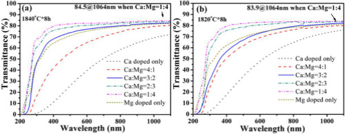 YAG基透明陶瓷以其易于制备和良好的物理化学性能等优势,是激光材料研究领域的热点和重点。中心微波功能材料团队张其土教授课题组以高纯氧化铝,氧化钇商业粉体为原料,CaO和MgO为烧结助剂,采用固相反应法结合真空烧结技术在制备了光学性能优异的YAG透明陶瓷,从而解决了现有非硅助剂下YAG透明陶瓷光学质量不理想等问题。该方法工艺简单,不需要昂贵复杂的高压设备,所制备的透明陶瓷晶粒尺寸细小,1.8~5.9 μm,粒径分布均匀,光学性能优异,其1064 nm透过率高于84.1 %,可用作固体激光器增益介质及光学窗口材料。
