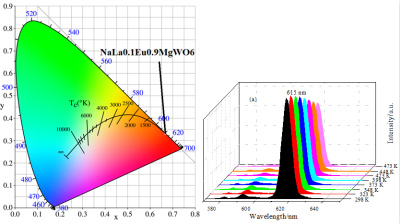 图2 NaLaMgWO6:Eu3+荧光粉的色坐标及热猝灭性能图