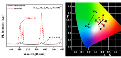图1 (Lu,Yb)AG:Dy退火前后的发光光谱(左)及不同Yb含量的荧光体的色坐标图(右)