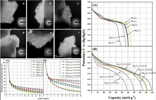 对MgxCo100-x (x=40, 45, 50, 55, 60, 63)合金的研究结果表明,随着x的增加,合金的放电容量先上升后下降,Mg55Co45的放电容量达到最大值(325 mAh/g)。对MgxCo100-x -5 at.% Pd (x=40, 45, 50, 55, 60, 63)的研究结果发现,随着x的增加,合金的放电容量单调增加,Mg63Co37-5 at.% Pd 合金的电化学容量达到500mAh/g。此外,Pd的添加还提高了合金电极的动力学性能和循环稳定性。