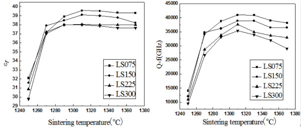 XRD物相分析表明,适量的双掺杂不会使陶瓷内部产生第二相或者杂相,由于掺杂离子半径远大于Zr4+ (0.72Å), Sn4+ (0.69Å)和Ti4+(0.61Å),掺杂离子进入陶瓷内部后会使陶瓷的体积发生扩张,导致XRD主峰向着小角度方向偏移。ZrSnTiO4微波介质陶瓷密度、介电常数和介电损耗随着烧结温度的变化有着非常类似的变化规律,在双添加一定量时,在1310-1330摄氏度烧结,获得陶瓷微波介电性能最佳:ρ ~ 5.10 g/cm3,εr ~ 39.56,Q × f ~ 41000 GHz (at 5.6 GHz),τf ~ -2.65 ppm/°C。目前已发表在Ceram. Int. 2016, 42(10):12306-12311。
