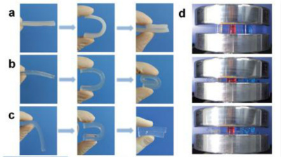 得到的双网络水凝胶呈现透明或者是半透明的外观,水含量在84-96%。值得一提的是,这种水凝胶可以折叠,压力解除后可以迅速恢复原始形状。另外,这种凝胶具有很好的形状可塑性。作为概念的展示,研究者将其制备成球状。这个凝胶球具有很强的机械性能与恢复性能,甚至可以作为乒乓球来使用。