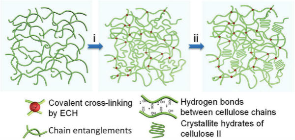 为了使凝胶材料获得高强度性质,研究者使用双网络水凝胶的思路进行制备。具体方法为:先将纤维素溶解在氢氧化锂/尿素的混合溶液中,随后加入环氧氯丙烷作为交联试剂,在一定时间后,就形成了第一个化学交联的三维网络。再进行中和,这样就形成了基于氢键、链缠结和纤维素II微晶水合物的的第二个三维网络。