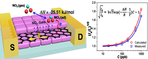 中国科公司新疆理化技术研究所环境科学与技术研究室科研人员首次设计并制备了基于rGO/TiO2(还原氧化石墨烯/二氧化钛)纳米异质结材料的ppb级NO2传感器,该传感器对NO2响应优异,在200℃时检测限为1.5 ppb。科研人员据此传感材料建立模型,从气体吸附改变材料表面电势的角度,提出了以气体为门电压的气体场效应纳米传感器概念,并以此为前提开创性的阐释了气体吸附与传感器信号和吸附热力学的内在关系。科研人员有机的将气体浓度、表面电势与场效应晶体管理论联系起来,建立了传感器响应大小与标准摩尔吸附焓、气体浓度、温度之间的定量关系。通过测试传感器在不同浓度和温度条件下的响应大小,推导得到NO2在TiO2表面标准摩尔吸附焓为-25.51 kJ/mol,与文献报道的-23.56 kJ/mol的理论值保持良好的一致性。在此基础上,科研人员将建立的模型和得到的标准摩尔吸附焓用于传感器的标定,实现了仅需要少量测试即可获得响应大小与温度、浓度的定量对应关系。此外经验证,在200℃时计算值与测量值在0-1 ppm的浓度范围内误差小于9%。